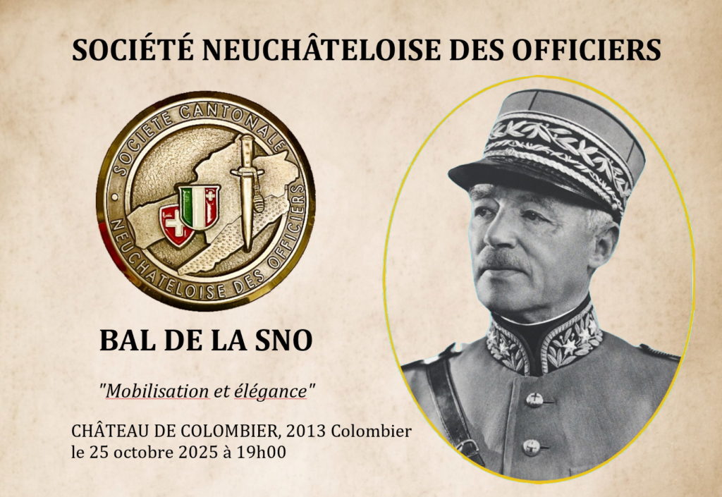 Le comité de la SNO a le plaisir de vous convier à son bal annuel qui, cette année, célèbre les 80 ans de la fin de la Mob 39-45. Ce sera une soirée empreinte de raffinement, inspirée par l’époque de la mobilisation de l’armée 1939–1945 et par les valeurs inculquées par le Général Guisan. Uniformes d'époque, drapeaux, matériel des années quarante et musique illumineront ce bal historique.